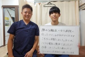 腰の分離症になり、病院に行ったけどなかなか良くならず、こちらに受診しました。